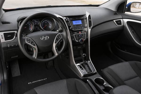 Standard GT equipment was already respectable. Hyundai listed the 148-hp 1.8-litre engine, six-speed transmission choices, heated front seats, cruise, tilt-and-telescopic steering, Bluetooth hands-free phone capability, Blue Link telematics, fog lamps, daytime running lights, a rear wiper, integrated rear spoiler, metallic interior trim accents, and 16-inch alloys. The GT also got the driver-selectable steering modes and a sport-tuned suspension tune, which helped separate it from the softer Elantra sedan.