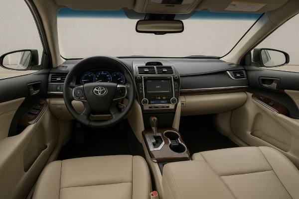 Inside, the Camry prioritizes wide entry openings, a low cowl, and excellent outward visibility. Rear-seat legroom is very competitive, and the trunk’s square aperture and low liftover height make grocery, stroller, or suitcase duty easy. Material quality is pragmatic—soft-touch in high-contact zones with durable plastics elsewhere—and the switchgear follows Toyota’s simple-to-learn logic. Early cars offer straightforward Display Audio with Bluetooth and USB; later 2013–2014 models expanded connectivity and backup camera availability across more trims. The driver’s seat and wheel have broad adjustment ranges, accommodating a wide height spectrum without forcing knees into the console.